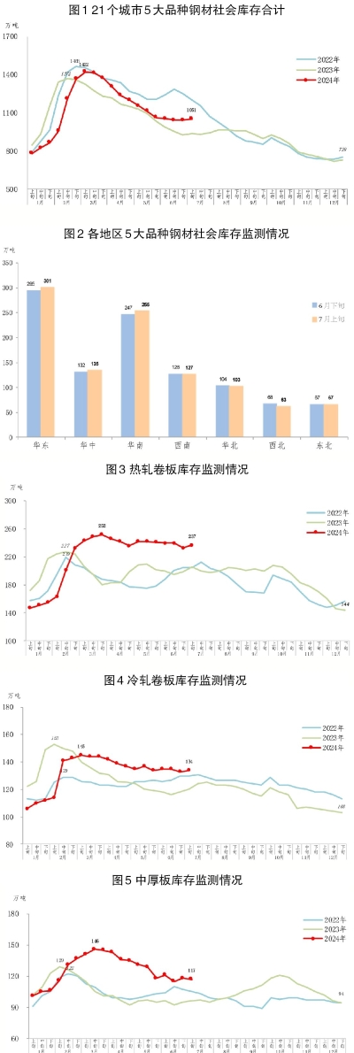 中国钢铁工业协会市场调研部7月上旬,21个城市5大品种钢材社会库存为1051万吨,环比增加10万吨,上升1.0%,库存连续11旬下降后在本旬首次回升;比年初增加322万吨,上升44.2%;比上年同期增加114万吨,上升1...