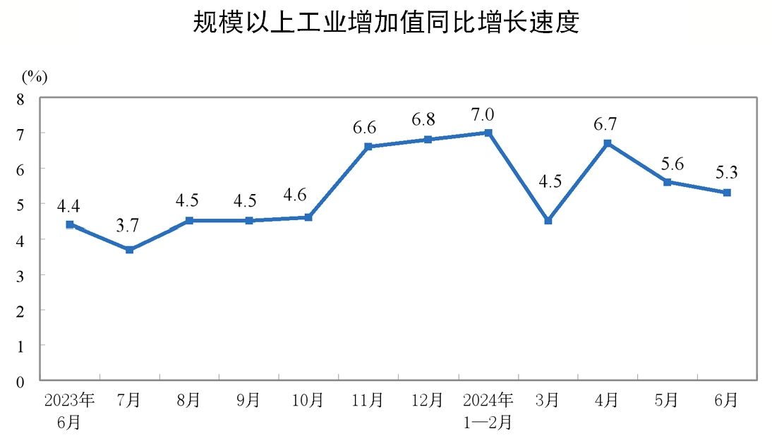6月份,规模以上工业增加值同比实际增长5.3%(增加值增速均为扣除价格因素的实际增长率),环比增长0.42%,其中黑色金属冶炼和压延加工业增加值同比增长3.3%;钢产量为9161万吨,同比增长0.2%。