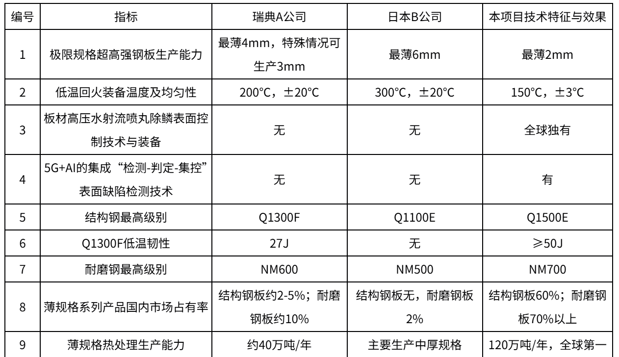 由表1可知,本项目在多个方面超过了同行,尤其在超高强钢板的生产能力、低温回火精度、钢材性能及热处理能力上都具有显著优势。特别是最薄生产能力、低温回火精度、市场占有率以及生产能力等方面,本项目不仅在国内市场占据主导地位,在国际上也具备了强大的竞争力。这些优势为满足高端结构钢和耐磨钢市场的需求提供了强有力的技术保障,并将进一步推动全球钢铁产业的技术进步和市场拓展。