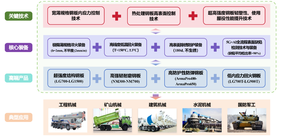 项目研发的系列关键装备生产的高品质薄规格热处理钢板相继应用于Caterpillar、KOMATSU、中联、三一、徐工、中国重汽、中集等企业大型工程机械、矿山机械、冶金机械等关键部件制造,如101米全球最长臂架泵车、4500吨履带起重机SCC98000TM等大国重器;项目产品突破了多个世界之最:热处理钢板规格最薄、级别最高,市场占有率达70%以上,不但满足了我国高端装备制造业对高性能超高强度钢板制造的急需,还实现了欧美等钢铁强国的反向出口,提升了国家自主保障能力和国际影响力,经济和社会效益极其显著。