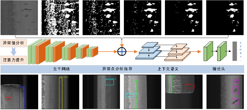 研发出基于深度学习驱动的多元网络融合钢板表面缺陷检测技术,解决单一模型识别过程中的瓶颈问题。构建了基于CycleGAN的跨域缺陷数据生成模型,通过迁移缺陷至不同钢种背景,有效解决了训练样本集不完备的挑战。将传统异常点分析模块融入检测网络,打造出语义指导下的注意力增强模型,使得模型在缺乏特定类别缺陷样本的情况下,也能展现出强大的预见性,从而增强检测的可靠性。设计半监督泛化调优策略,通过多态样本输入与教师网络的协同作用,有效促进学生网络对复杂缺陷特征的深度吸收,强化模型对复杂背景、氧化铁皮、水渍等多种干扰因素的辨别能力,确保检测的稳定和准确。