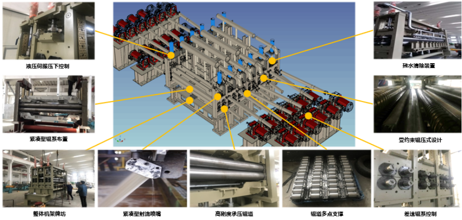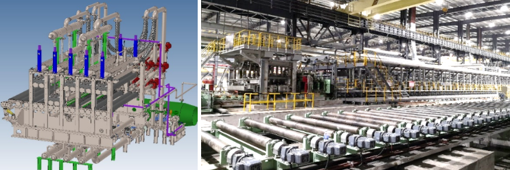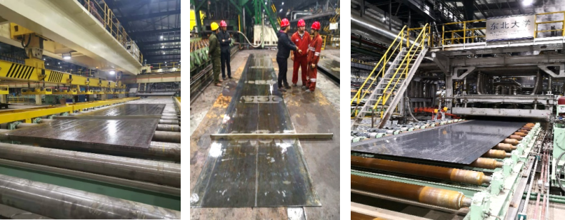 项目研制成功国际首套极薄钢板辊压式淬火装备和2-12mm钢板高平直度淬火技术,2mm钢板整板淬火不平度≤2mm,国际上首次实现批量淬火生产(图6)。提出了极薄高强钢板受约束淬火变形机制和低残余应力淬火方法,发明多机架高刚度伺服控制辊系、阵列射流水刀、板形智能检测与自学习等核心系统,开发成功高转矩大速比传动控制技术、液压多缸同步控制技术、差速拉伸淬火技术、非对称淬火技术、多机架辊缝优化控制技术、头尾板形控制技术等成套极薄钢板辊压式淬火技术,2mm厚钢板整板淬火不平度≤3mm,钢板淬火后无头尾叩/翘、中/边浪等板形缺陷,为高品质超高强钢板的生产奠定装备技术基础。