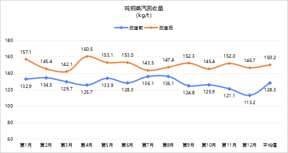 改造前后,电炉吨钢蒸汽回收量平均值从128.3kg/t提升至150.2kg/t,提升比例约17%。其中2024年10月份吨钢蒸汽回收量最高达160.5kg/t,提升比例约25%。