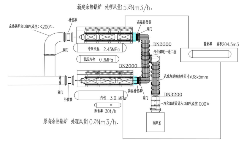 改造后汽化烟道设计入口烟气温度1000℃,采用强制循环,循环管路与新建锅筒连接,现有锅筒循环水、蒸汽管路与新锅筒之间增加阀门,具备切换使用功能。