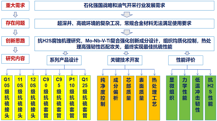 基于中碳Cr-Mo合金钢中加入微合金元素成分设计体系,研制出了抗硫化氢腐蚀石油钻具用钢以及石油套管用钢,实现了API钢级全覆盖。