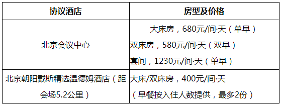 本次年会住宿协议酒店为北京会议中心和北京朝阳戴斯精选温德姆酒店(后续将根据参会代表预订酒店情况适当增加协议酒店,请关注年会网站),并提供会场与酒店间的接驳。住宿费用自理。